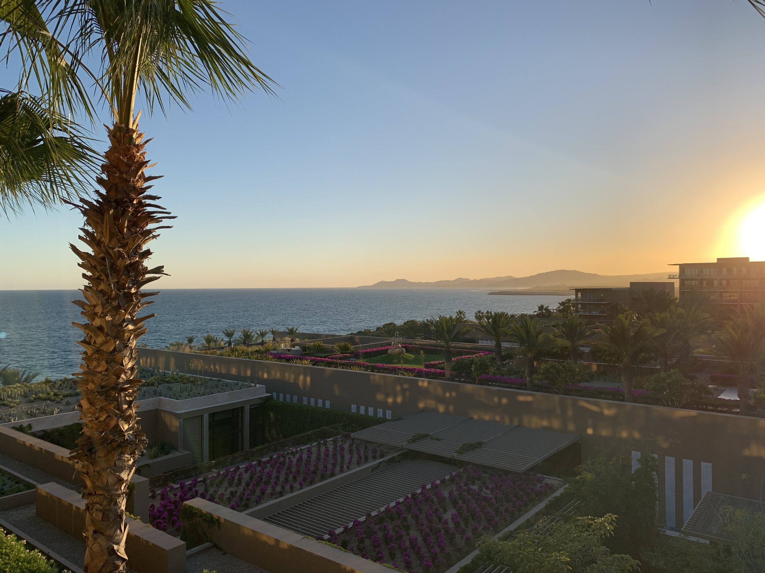 We stayed at a really nice hotel (JW Marriott Resort in San José del Cabo using points that Travis had from work travel. Despite the “free” hotel room, we spent a lot on food/alcohol in the 24 hours we were there. That said, the hotel was beautiful and we had a really nice time. The hotel is on the side of a very steep hill and has multiple stretches of it that seem to have sunken gardens along with lots of tiered swimming pools.