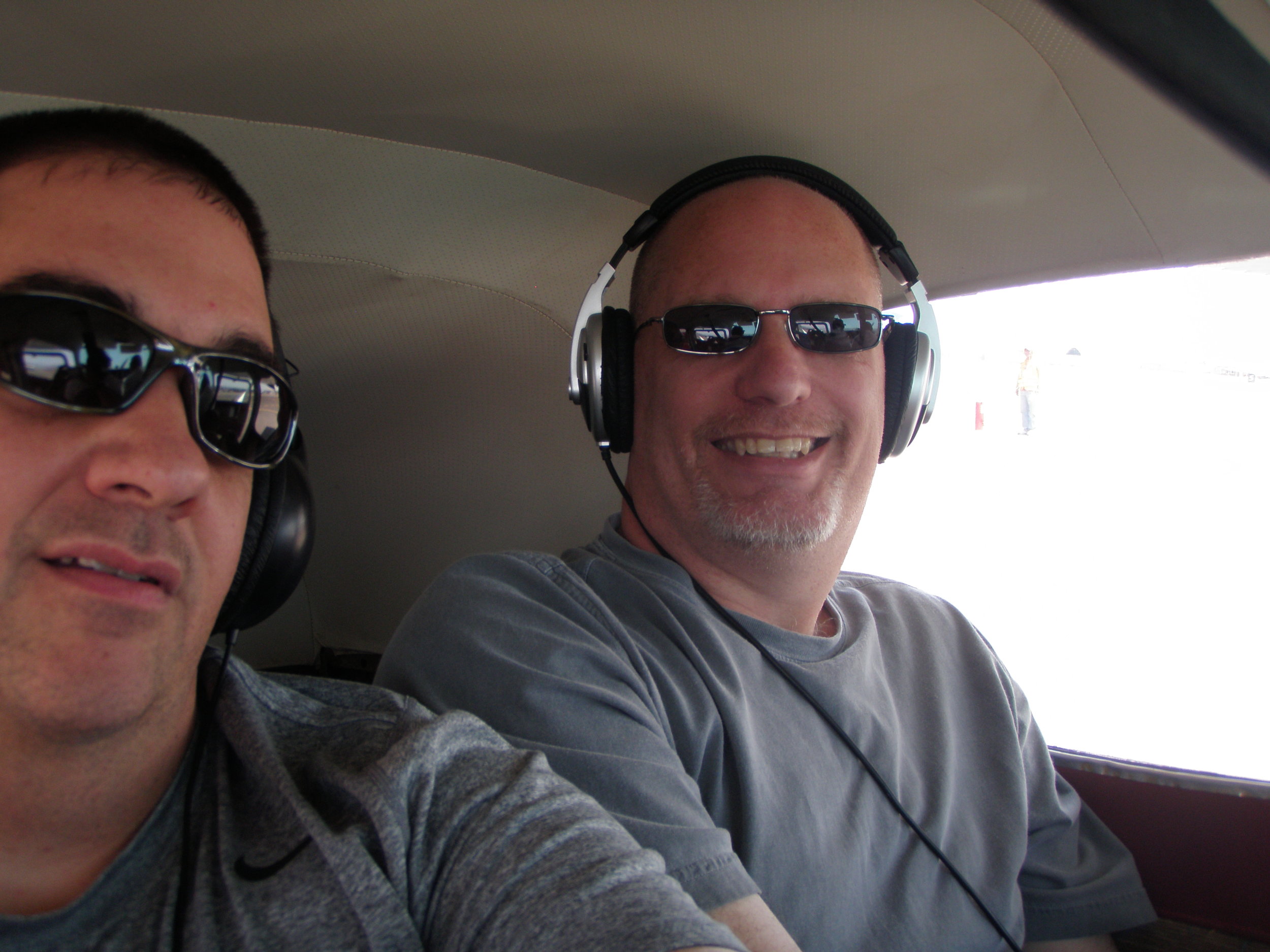 We finally get matched up with our pilot, Marco. We have a co-pilot whose name we don’t catch and we’ll be taking the tour in a 4-seater Cessna. The co-pilot makes a point of showing us the barf-bags in the seat backs. There should have been ominous fore-shadowing music playing. We taxi, get the clearance, and off we go!