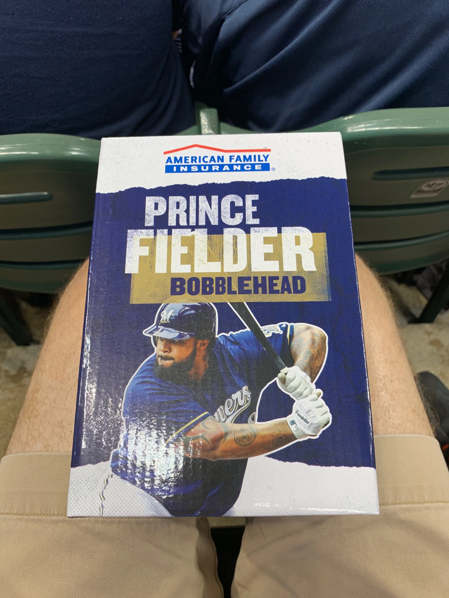 The Brewers have a ton of things for fans to do once you’re inside. Doug wanted to do the big slide in the outfield (which Bernie, the Brewers mascot goes down when they score a home run), but it was the wrong direction. It’s also bobblehead day at the game. Doug took the Prince Fielder (who?) bobblehead (it’s free stuff!), but Travis wisely rejected his, much to the consternation of the woman handing them out.