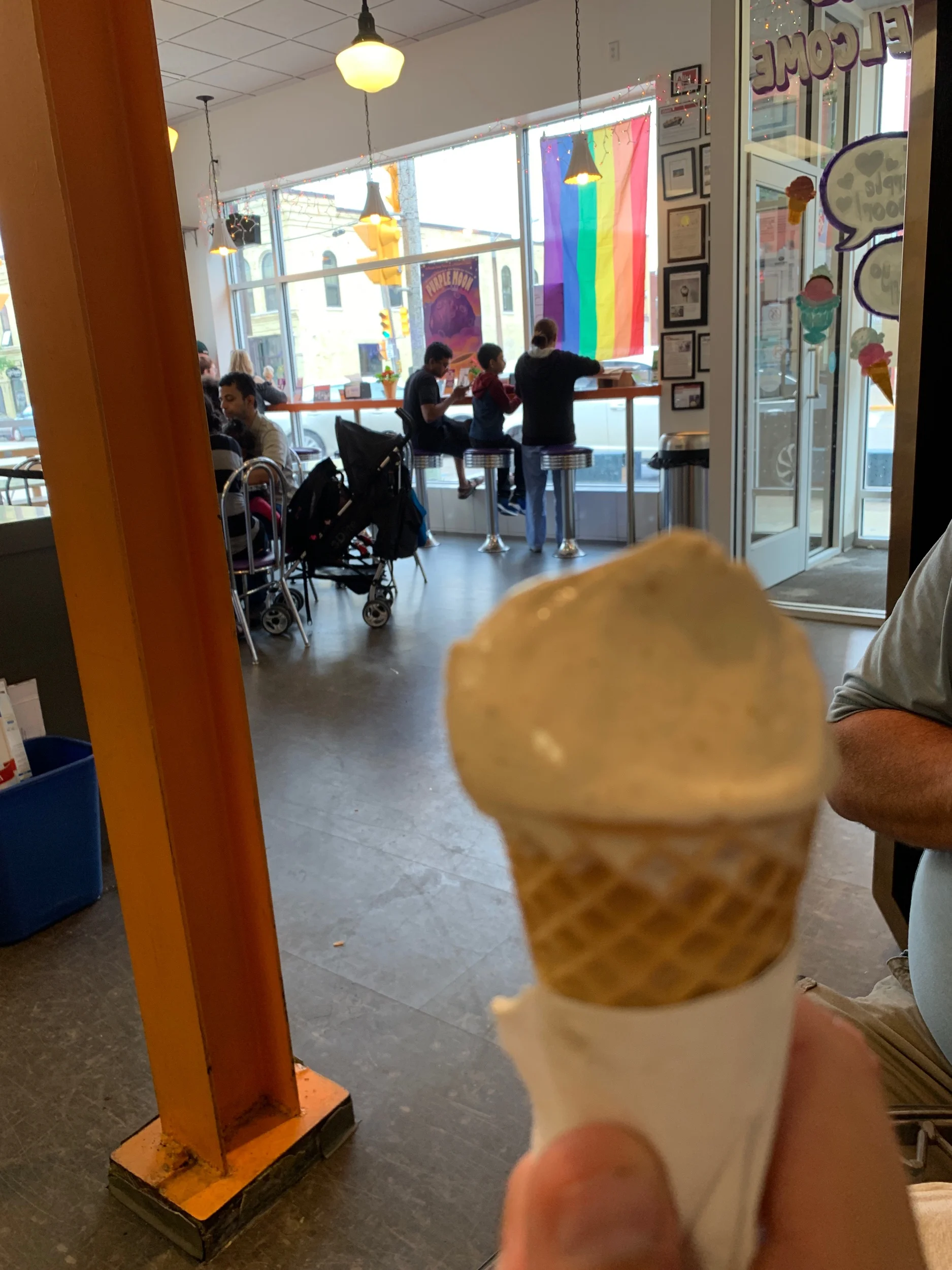 We stop for Ice Cream after the game at Purple Door ice cream. It’s yummy. Doug has Graham Cracker and Peanut Butter. Travis has cinnamon. We both leave happy!