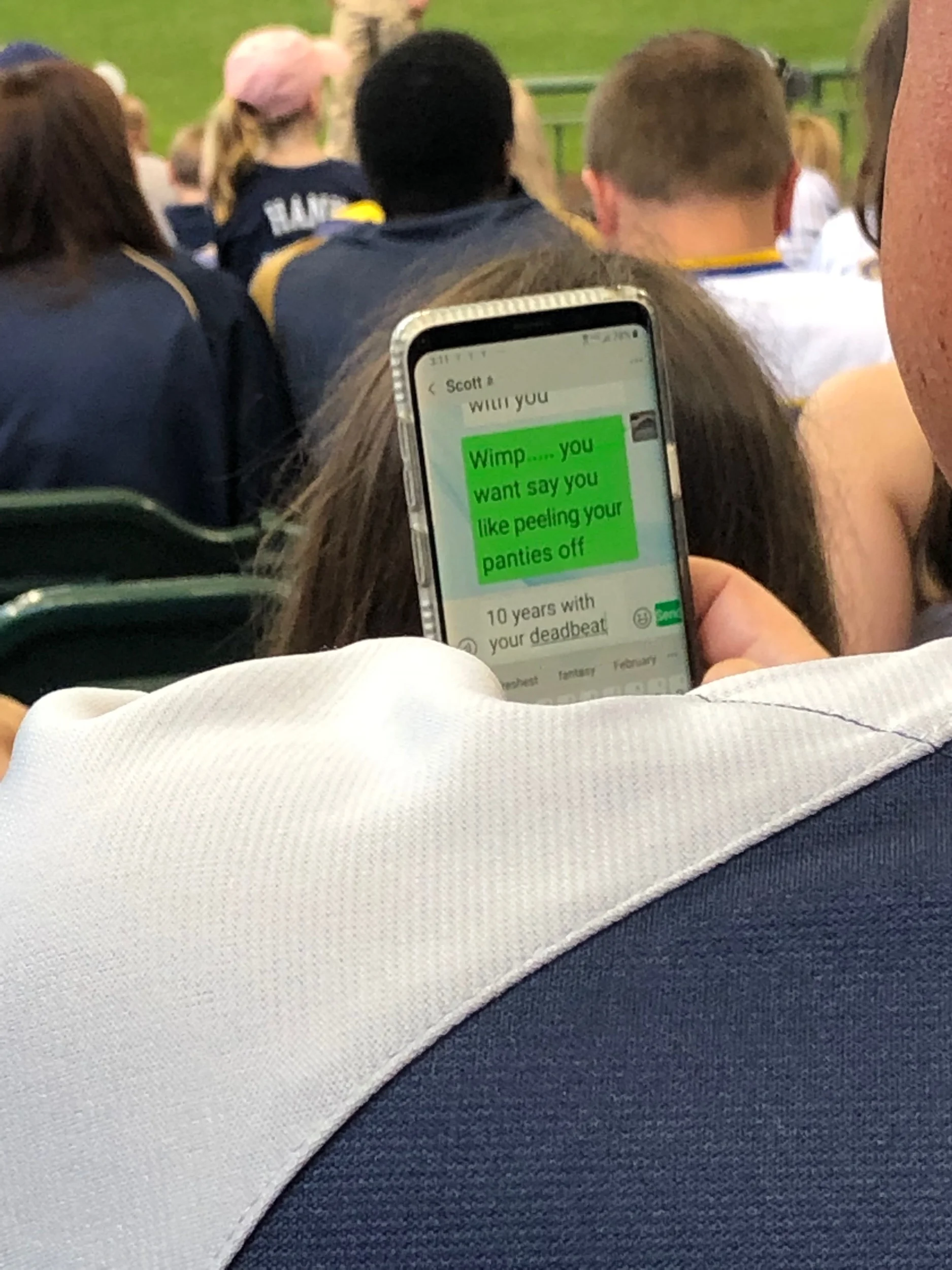 Oddest part of the game was the guy in front of Travis who was “sexting” with someone while sitting next to his dad and two sons (we’re assuming it was his mistress based on content). It wouldn’t have been so obvious if he wasn’t using a crazy big font.